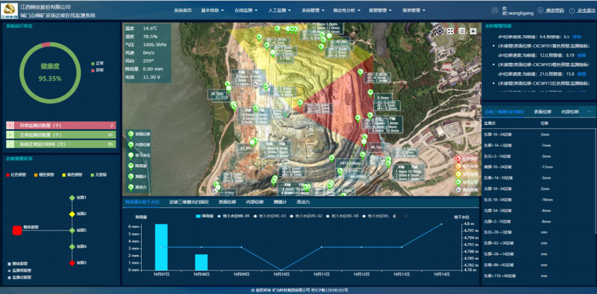 性能指标:监测响应时间<5s;边坡稳定性预警准确率超过90%,能够实现智能稳定性分析与精准预警。适用范围:已安装了在线监测系统的露天采场边坡、排土场边坡和自然边坡。