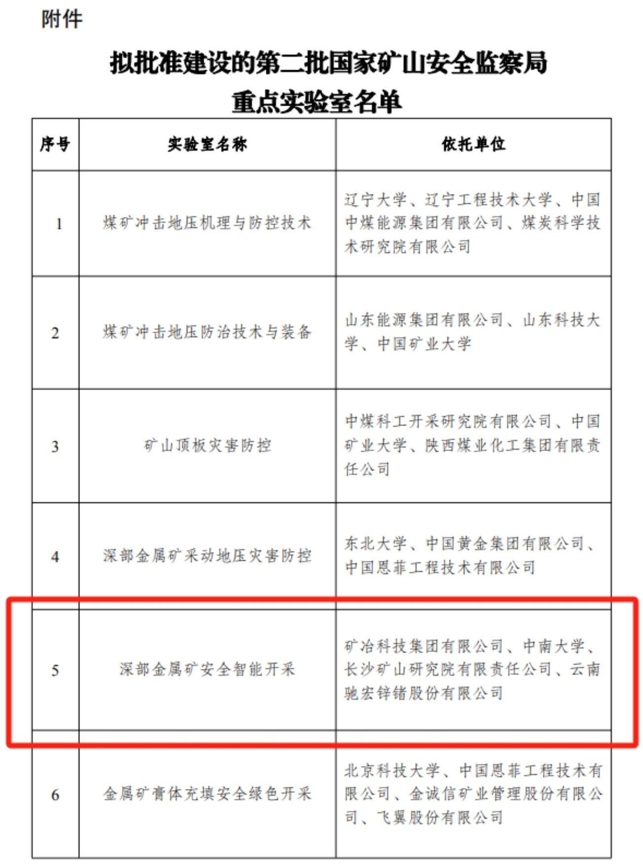 近日,国家矿山安全监察局发布《国家矿山安全监察局关于批准建设第二批重点实验室的通知》(矿安函〔2024〕33号),全国共有13家实验室获批。由矿冶集团牵头,联合中南大学、长沙矿山研究院有限责任公司、云南驰宏锌锗股份有限公司申报的“深部金属矿安全智能开采国家矿山安全监察局重点实验室”成功获批。这是乐动在线平台牵头建设的第一个国家矿山安全监察局重点实验室(国家部委级),体现了乐动在线平台在金属矿产资源深部开采领域的创新实力和领先地位,是矿冶科研平台建设的又一重要成果。